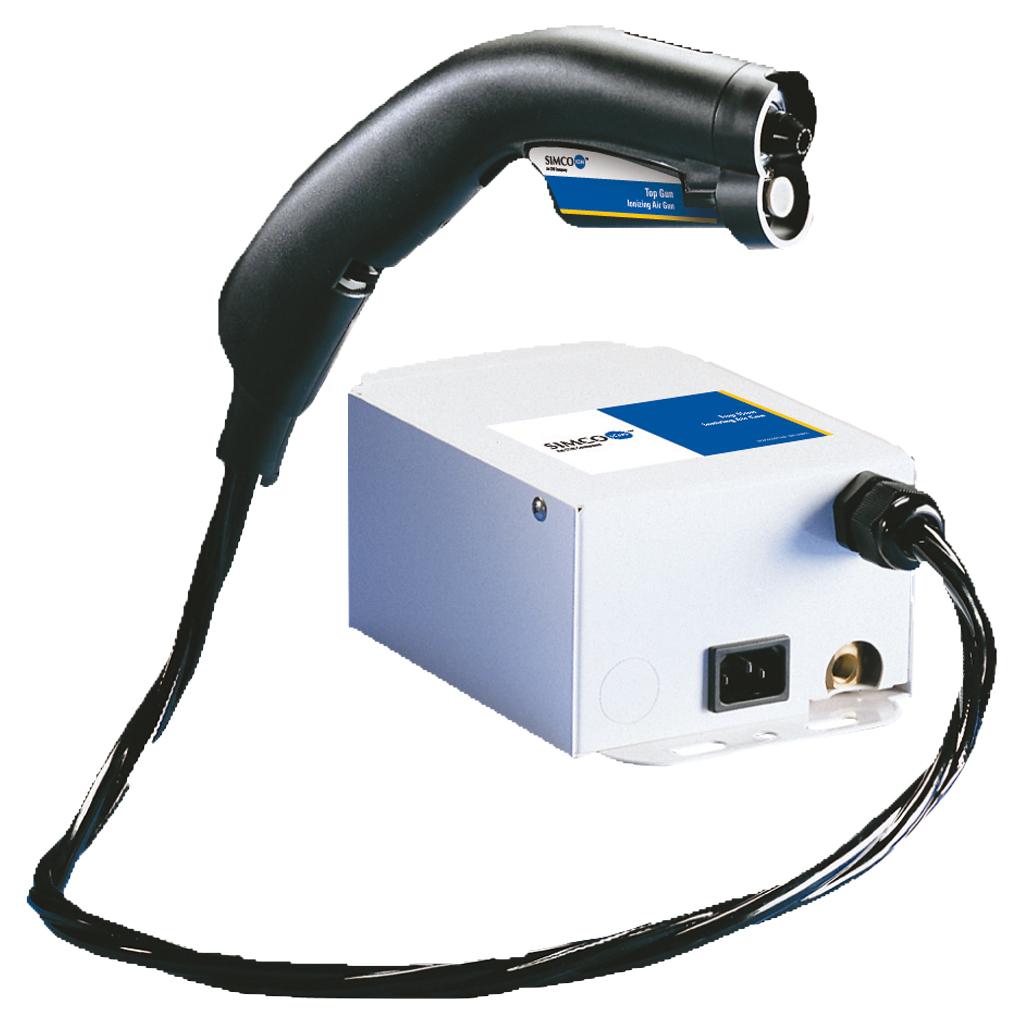 Le pistolet Top Gun Simco-Ion a été développé pour de nombreuses applications milieu industriel courant. Une grande production d'ions permet de neutraliser parfaitement les charges électrostatiques. Même à une faible pression d'alimentation, le soufflage d'air reste puissant. Un filtre à la sortie garantit un air épuré. D'un poids léger, il est extrêmement maniable. Le corps et le cable sont en matériaux dissipatifs. Les éléments suivants sont intégrés: molette pour régler le débit d'air et témoin néon de présence de haute-tension sur le coffret d'alimentation, lorsque l'air comprimé est activé.